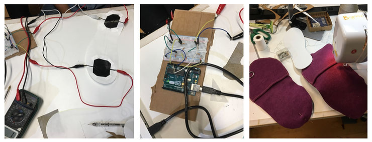 ​We focused on conductive thread as the primary sensor material, while also experimenting with conductive fabric, conductive paint, Velostat, felt, and foam. The goal was to design pressure-sensitive sensors embedded in the shoes that respond to tapping, shifting weight, and stepping patterns.​​​​​​
