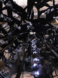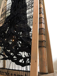 The sculpture, set within a vertical wooden loom, takes the form of a deconstructed cage skirt. By incorporating torn black textiles, embroidery, and embedded electronics, "Widow" reinterprets traditional Victorian mourning garments. This work symbolizes the unraveling and social marginalization that women experience in widowhood.